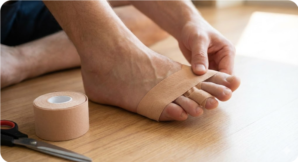 このように巻くことで、小指を正しい位置に誘導すると同時に、崩れてしまった足の「横アーチ」を人工的に作り出すことができます。