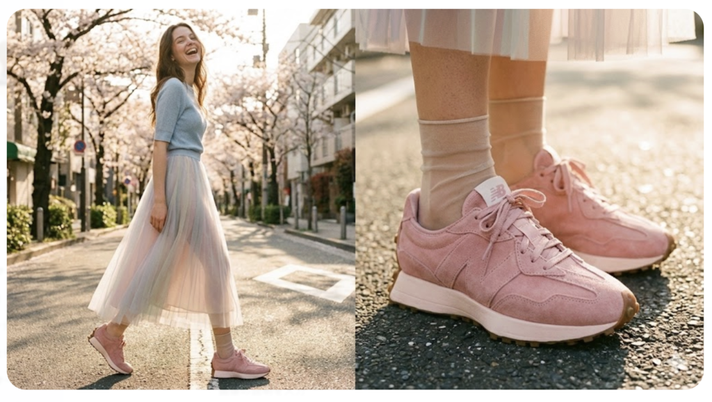例えば、ふんわりとしたボリュームのあるチュールスカートや、歩くたびに光を揺らすサテンのキャミソールワンピース。ここに、あえて少しボリューム感のあるパステルカラーのスエードスニーカーを合わせてみてください。