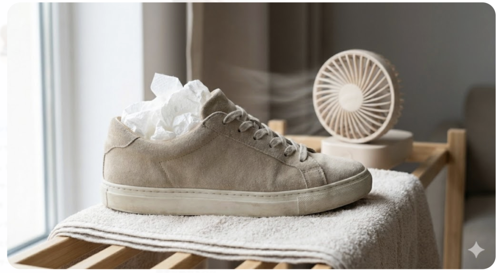 この時も擦るのはNGですよ。ある程度水分が抜けたら、中にシューキーパーや新聞紙(インク移りに注意)を詰め、型崩れを防ぎながら陰干しします。
