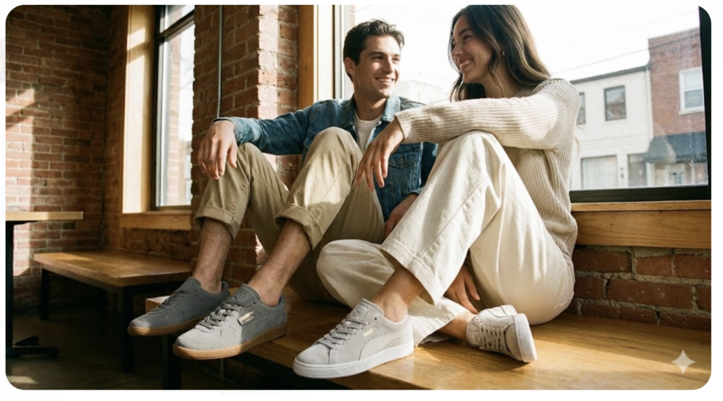 プーマのパレルモは、もともとインドアスポーツ用のシューズとして開発されました。1980年代のフットボールファンたちの間で、「スリムなシルエット×スエード」の組み合わせがステータスとなり、今のトレンドに繋がっています。歴史背景を知ると、一足への愛着がさらに深まりますね。