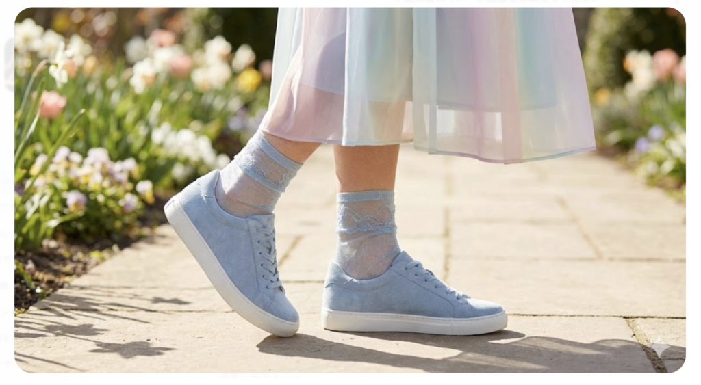 最近はラメ入りのシアーソックスや、繊細なレース素材の靴下をスニーカーの色とリンクさせるのが流行っています。例えば、ライトブルーのスエードスニーカーに、同系色の極薄シアーソックスを合わせることで、足元にレイヤード(重なり)が生まれ、細部まで計算された「おしゃれを楽しんでいる人」という印象を周囲に与えることができます。