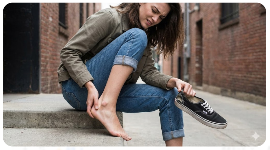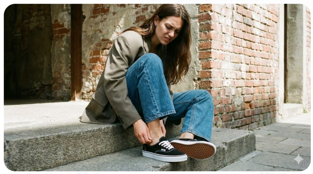 硬いキャンバス生地による踵の靴擦れと摩擦問題